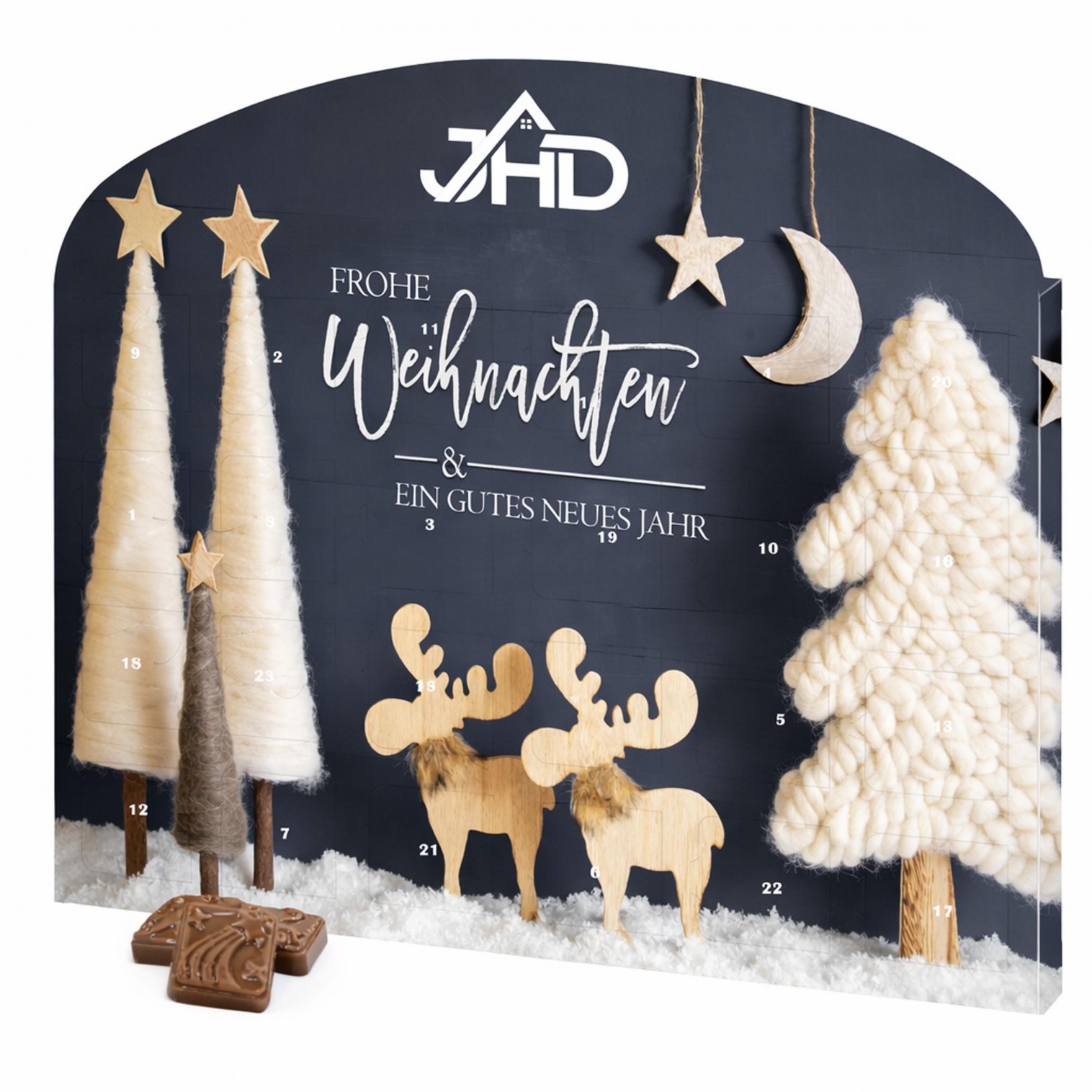 Tisch-Adventskalender, individueller Druck. Befüllt mit 75g Schokolade.