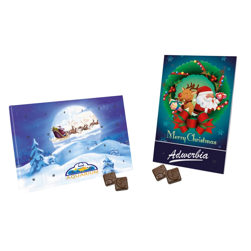 Tisch-Adventskalender, A5, individueller Druck. Befüllt mit 75g Schokolade.