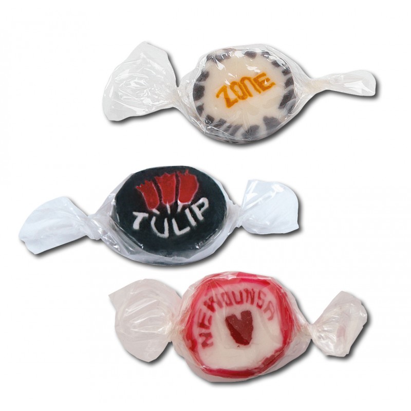 Handgemachte Lutscher, Fruchtgeschmack, eingelegter, durchgehender Text (Rückseite spiegelverkehrt). In unbedruckter Klarsichtfolie gewickelt.