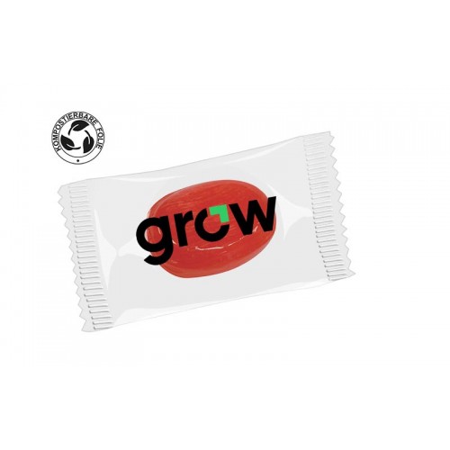 Bonbons im bedruckten Tütchen. Die kompostierbare Folie liefern wir in weiß oder transparent. Qualität: Fruchtbonbons gemischt, bestehend aus den folgenden Sorten: Kirsche, Apfel, Zitrone, Mandarine und Cola.