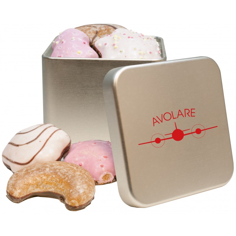 Silbermatte quadratische Dose veredelt mit Ihrer Werbung auf dem Dosendeckel, Dosenkorpus oder beides. Eine bunte Lebkuchen-Mischung in verschiedenen Formen machen aus dieser Dose den Top-Seller unserer KubiTins für Werbeaktionen in den letzten Monaten des Jahres.