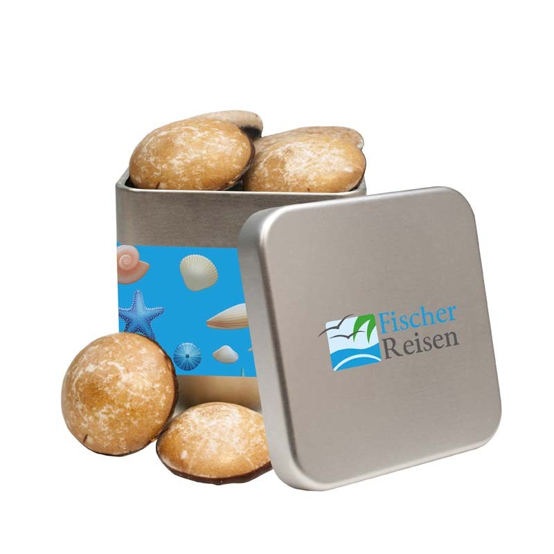 Silbermatte quadratische Dose mit farbigem Druck auf dem Deckel gefüllt mit Mini-Contrella von Weiss. Eine anspruchsvolle Verpackung für süße Werbung, die dauerhaft Verwendung findet.