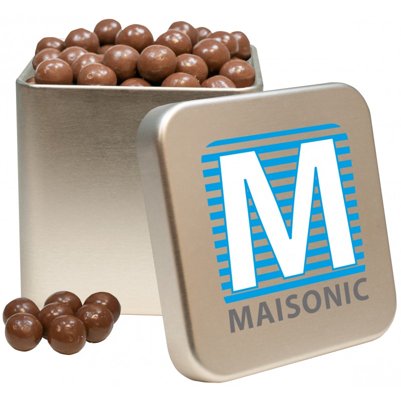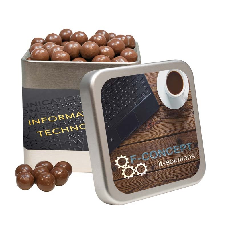 Silbermatte quadratische Dose veredelt mit Ihrer Werbung auf dem Dosendeckel, Dosenkorpus oder beides. Die Dose befüllen wir mit ca. 200g Knusperkugeln mit Schokolade dragiert, der Marke Brandt. Mit der KubiTin werden Sie einen süßen Nachgeschmack bei Ihren Kunden hinterlassen und bestimmt wird bald die nächste Bestellung folgen.