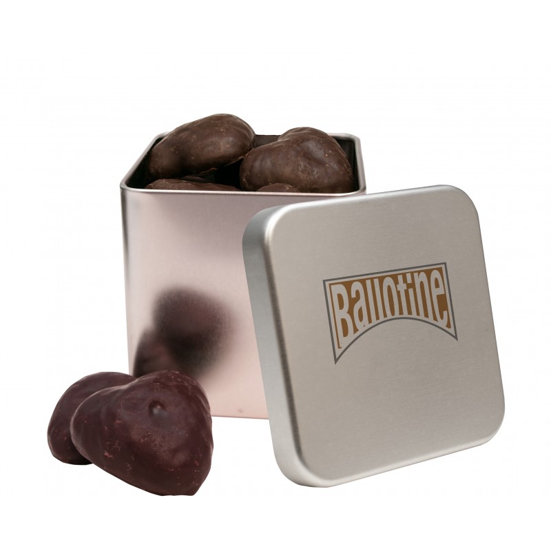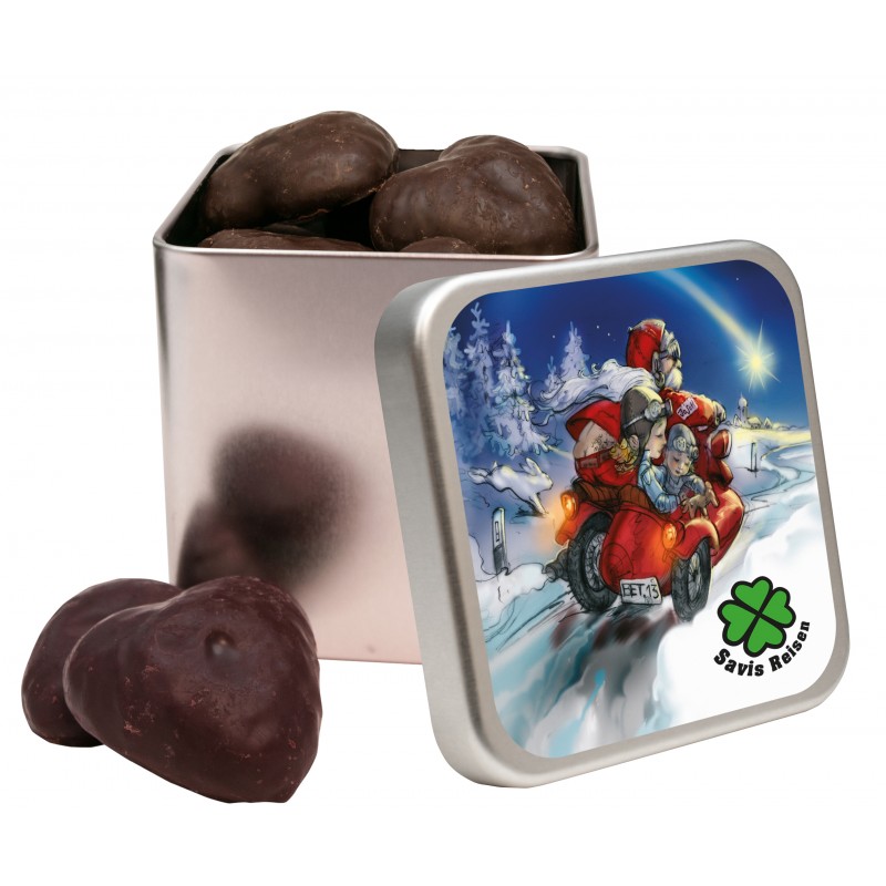Silbermatte quadratische Dose veredelt mit Ihrer Werbung auf dem Dosendeckel, Dosenkorpus oder beides. Befüllt wird diese Dose mit ca. 185g Lebkuchenherzen der Marke Lambertz. Anschließend kann die Dose mit Ihrer Werbung weiter als Tee- oder Gewürzdose von Ihren Kunden eingesetzt werden.