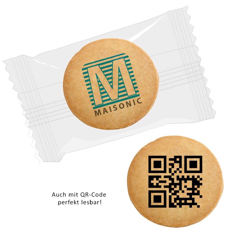 Ein runder Butterkeks wird farbig mit ihrem Logo und ihrer Werbung mit Lebensmittelfarben bedruckt. Jeder Keks wird in Klarsichtfolie in Tütchenform abgepackt.