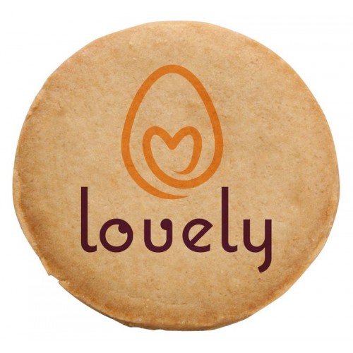 Ein runder Butterkeks wird farbig mit ihrem Logo und ihrer Werbung mit Lebensmittelfarben bedruckt. Jeder Keks wird in Klarsichtfolie in Tütchenform abgepackt.