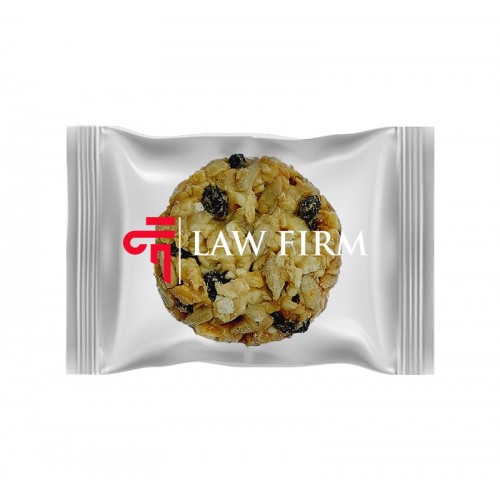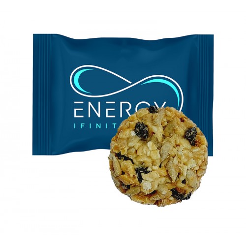 Vital-Gebäck aus Sonnenblumenkernen und Korinthen, einzeln verpackt im weißen oder transparenten Werbetütchen. Die Folie wird 4-farbig mit Ihrem Motiv gedruckt.