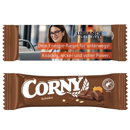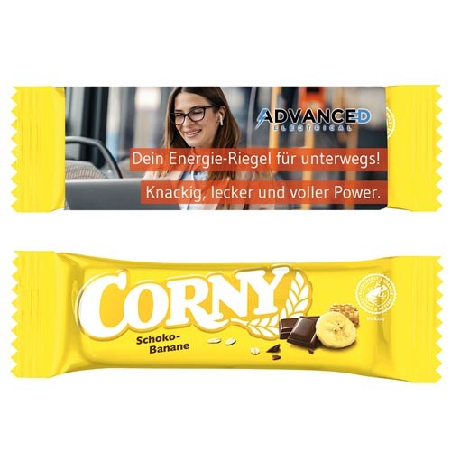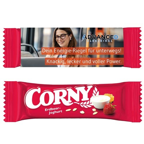 Corny-Riegel, original verpackt, im individuell bedruckten Werbeschuber.