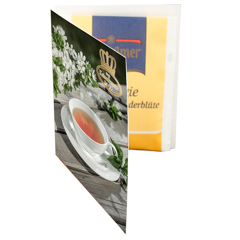 Eine beidseitig bedruckte Werbe-Klappkarte. Auf den Innenseiten kann 1 Teebeutel aufgebracht werden.