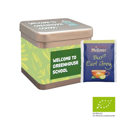 Quadratische Dose befüllt mit BIO-Tee-Beuteln der Marke Meßmer.– individuell personalisierbar mit einem bedruckten Etikett um den Korpus, einem bedruckten Deckel oder beidem.