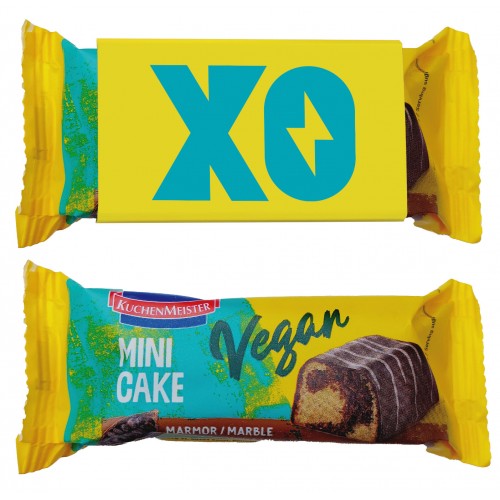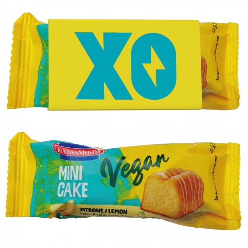 Veganer Mini-Kuchen der Marke Kuchenmeister, original verpackt, im individuell bedruckten Werbeschuber. Erhältlich in verschiedenen Geschmackrichtungen: Marmor oder Zitrone.