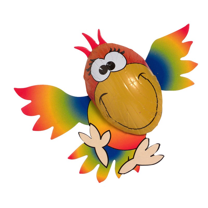 Schokoladen-Papagei in bedruckter Folie auf Karton, 2-fach sortiert. Edelvollmilchschokolade, Kakao 33% mindestens.
