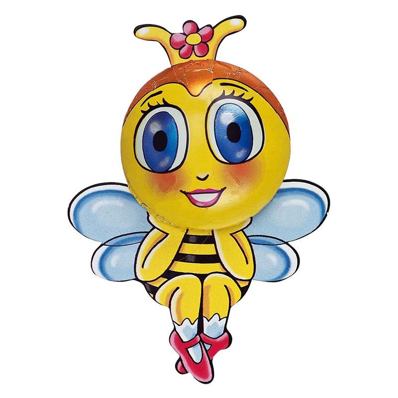 Schokoladen-Lady Bee in bedruckter Folie auf Karton. Edelvollmilchschokolade, Kakao 33% mindestens.
