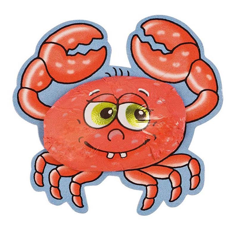 Schokoladen-Krabbe in bedruckter Folie auf Karton. Edelvollmilchschokolade, Kakao 33% mindestens.