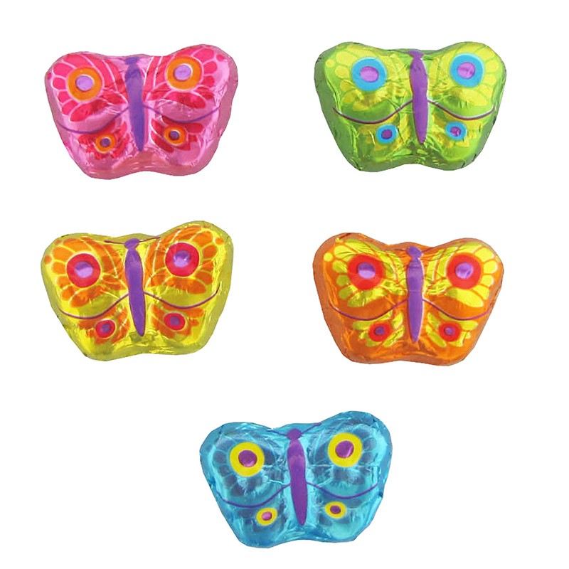 Schokoladen-Mini-Schmetterlinge in bedruckter Folie, 5-fach sortiert. Edelvollmilchschokolade, Kakao 33% mindestens.