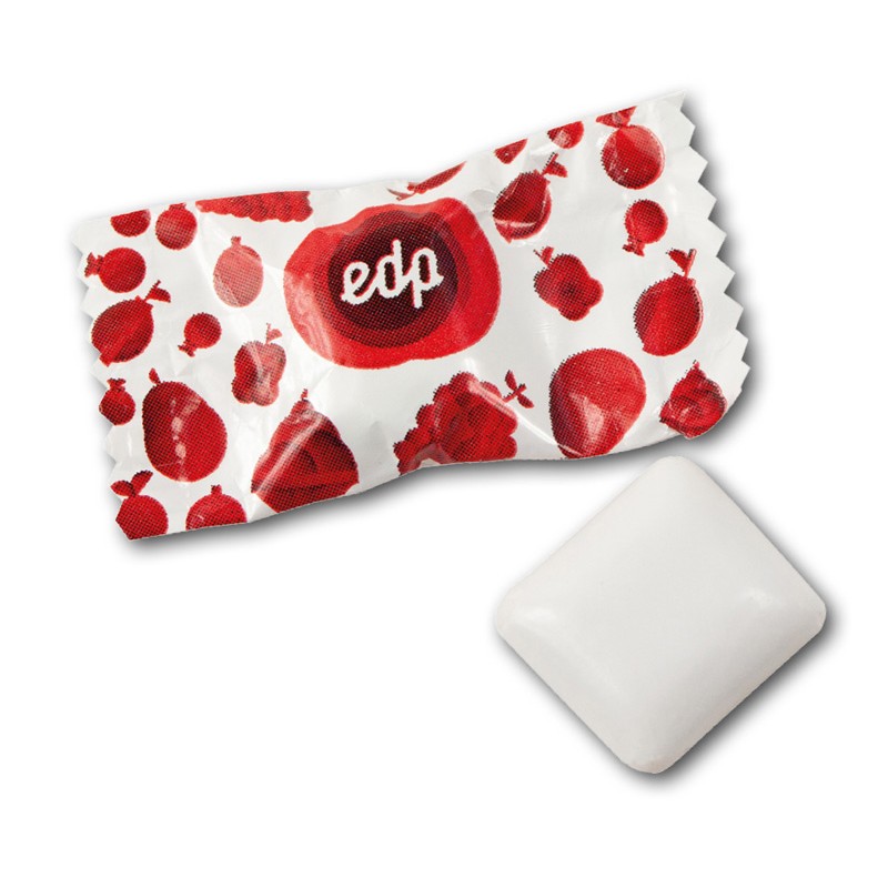 Zuckerfreier Kaugummi im individuell bedruckten Werbetütchen. Die Folie liefern wir in weiß.