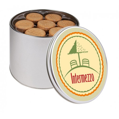 Runde Dose, befüllt mit runden, geprägten Keksen im Tray. Auf dem Dosendeckel wird ein individuell bedrucktes Etikett aufgebracht.