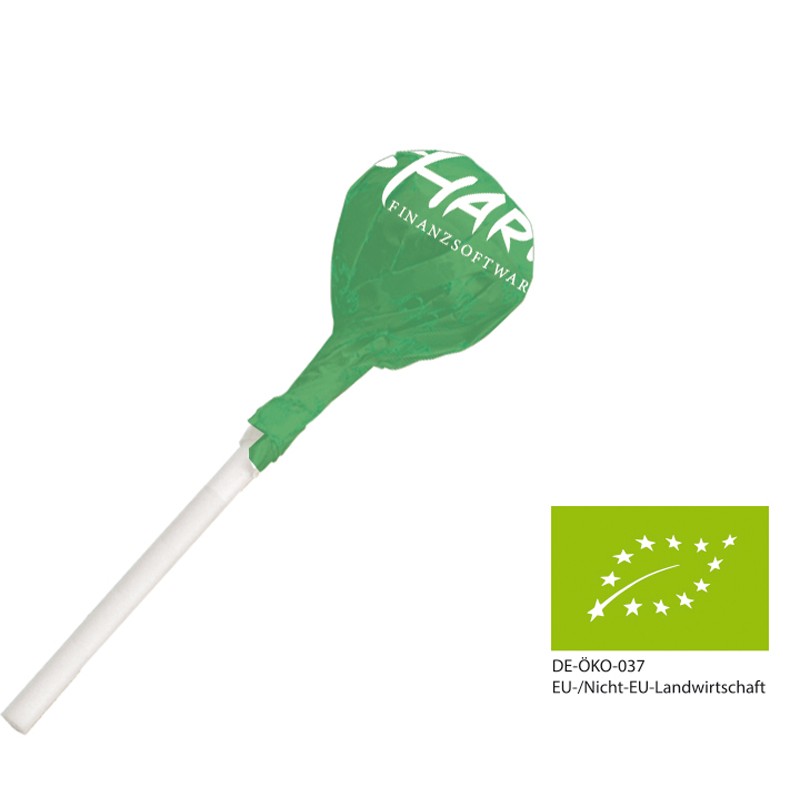 BIO Kugellutscher in bedruckter weißen oder transparenten Folie. Ihre Werbung wird mittig zentriert auf die Folie gedruckt. Folie um den Stil versiegelt. Sie können eine Geschmacksrichtung je 6.000 Kugellutscher bestimmen.