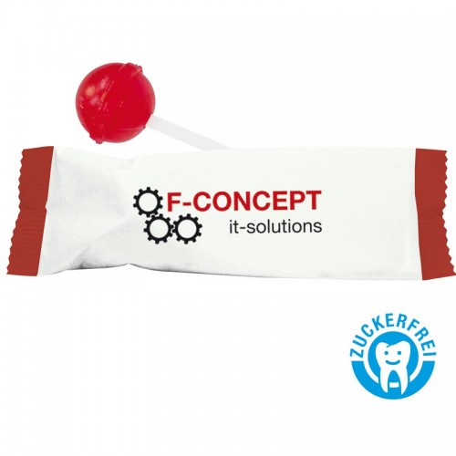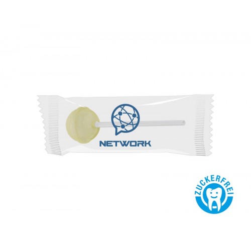 Zuckerfreier Kugellutscher im bedruckten Flow-Pack. 1 Geschmackrichtung je 5.000 Stück.