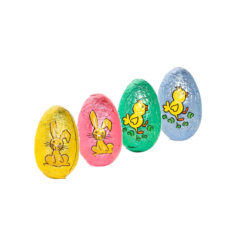 Schokoladen Osterei als Hohlform, foliiert. Die Folie bedruckt in verschiedenen Motiven.