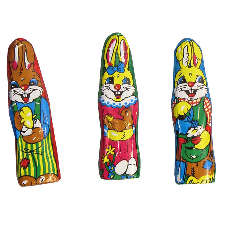 Schokoladen-Osterhäschen in bedruckter Folie, 4-fach sortiert. Edelvollmilchschokolade, Kakao 33% mindestens.