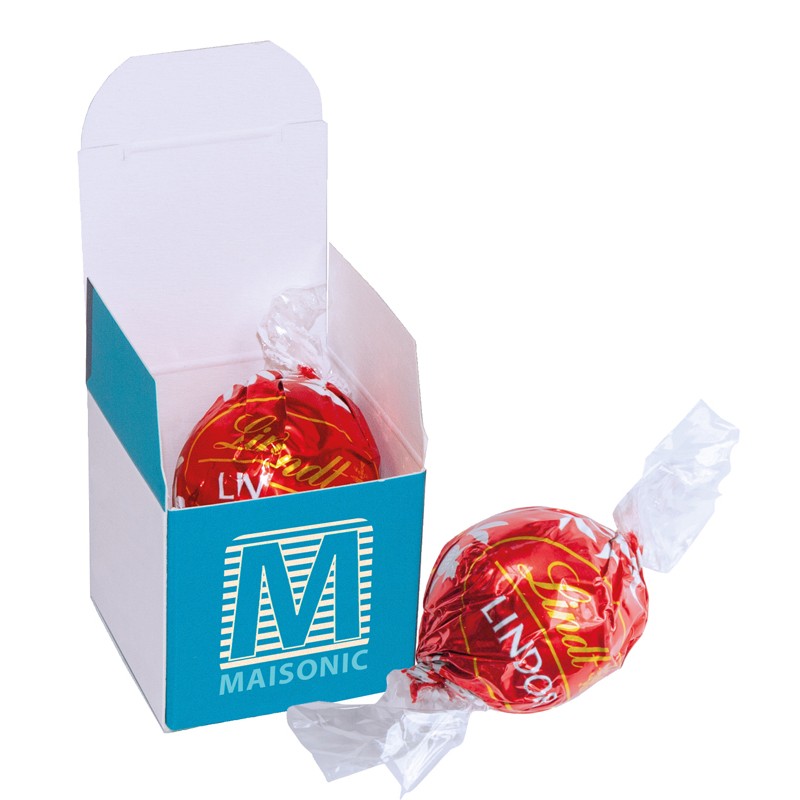 Bedruckte Würfelverpackung befüllt mit einer original Lindor Praline. Der Würfel wird auf fünf Seiten mit Ihrem Motiv gedruckt.