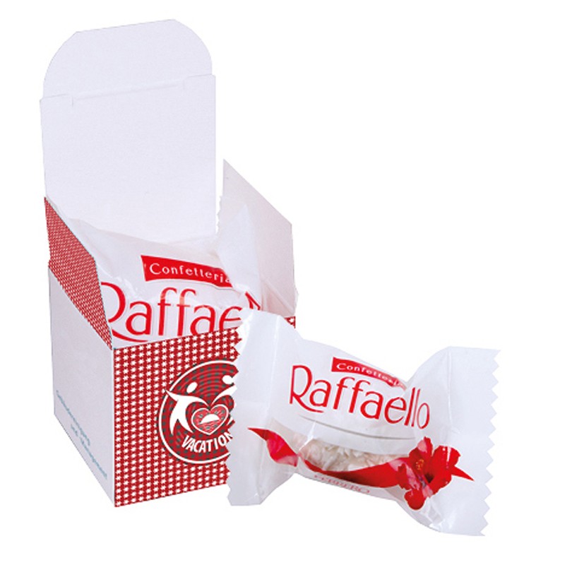 Bedruckte Würfelverpackung befüllt mit einer Raffaello. Der Würfel wird auf fünf Seiten mit Ihrem Motiv gedruckt.