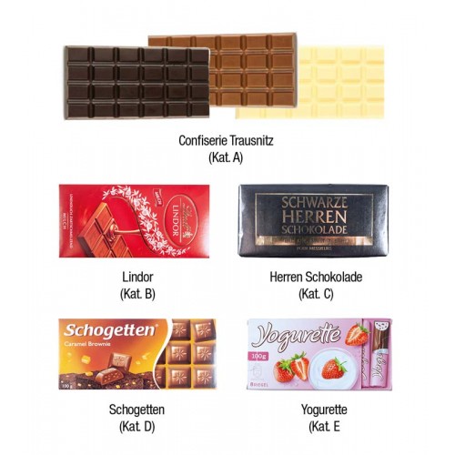 Einen 4-fbg. bedruckte Umschlag gefüllt mit: 100 g Schokoladentafel in Confiserie-Qualität einzel in Klarsichtfolie aus Edle Vollmilchschokolade oder Edle Zartbitter-Schokolade, eine 100 g Lindt-Lindor Milch Schokotafel, eine 100 g Schwarze Herren Schokolade - Edelbitter, 100 g Schogetten oder 8 Riegel Yogurette.