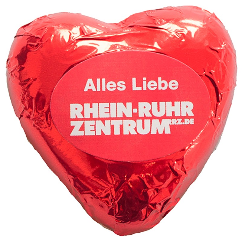 Massives Herz aus Edel-Vollmilchschokolade in roter oder goldener Folie verpackt. Ein individuell farbig bedrucktes, ovales Etikett wird vorderseitig aufgebracht. Deutsche Markenschokolade.