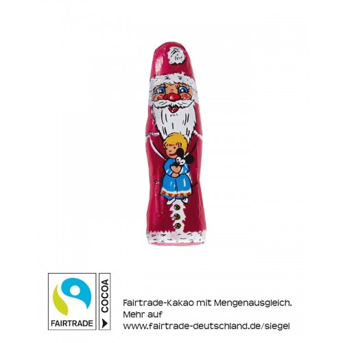 Schokoladen-Weihnachtsmann in bedruckter Folie. Edelvollmilchschokolade, Kakao 33% mindestens.