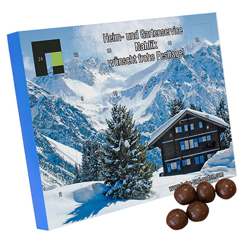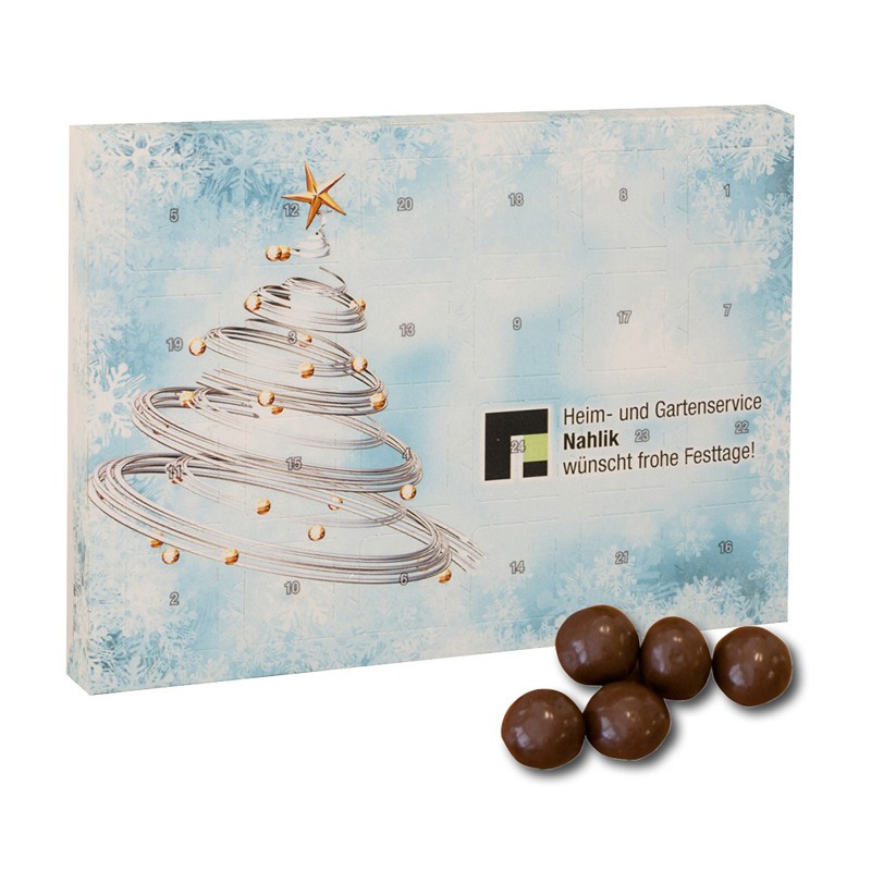 Small table Advent calendar, printed completely individually. Filled with crispy chocolate balls.