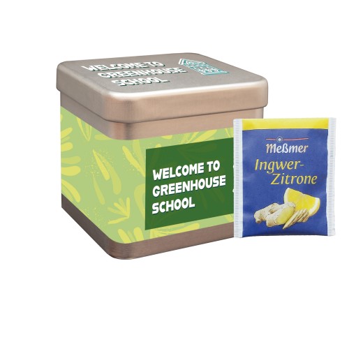Personalized square tin filled with tea bags. Customization options include: printed label around the body, printed lid, or both printed lid and body label.