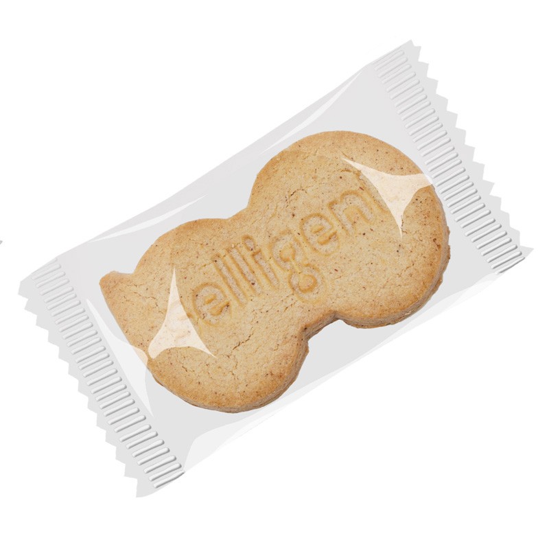 Biscuits with the shape as given by your logo, and the logo itself indented in the biscuit. Biscuit single flowpacked.