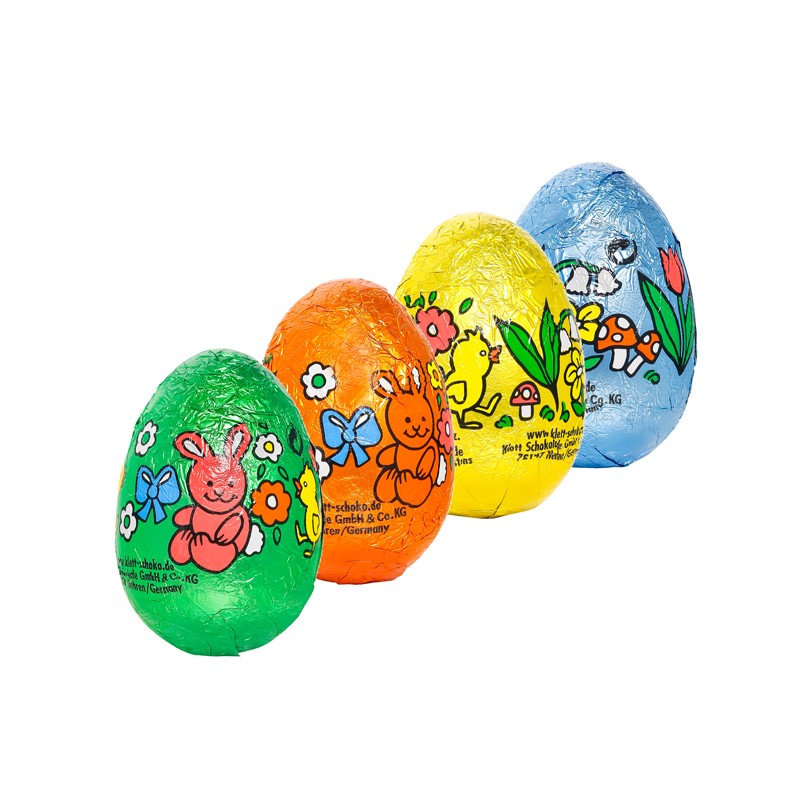 Maxi Easter chocolate egg, made out of hollow chocolate, wrapped in standard printed foil. Different easter designs on the foil.