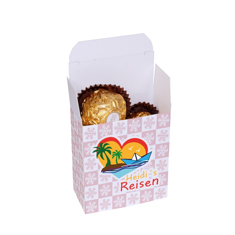 Resealable box filled with 3 original Ferrero Rocher pralines (seasonal item).The cube is printed with your motive on five sides. Promotional placement on all sides of the box.