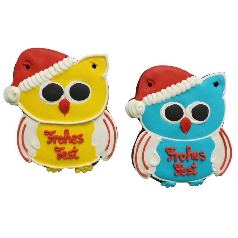 Exquisite Dresdner gingerbread with the shape of an owl with cat according to traditional recipe. Decorated with coloured or white frosting by hand and personalized with printed wafer or frosting by hand. Each gingerbread is packed in transparent glossy foil.