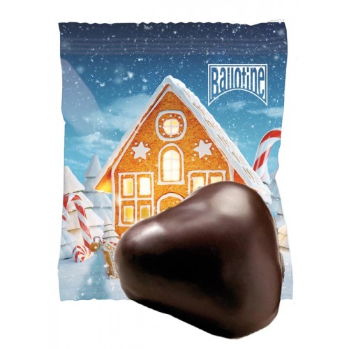 Gingerbread heart with apricot filling in flowpack individually printed. The foil is white.