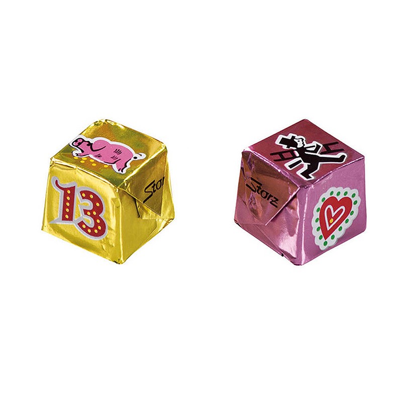 Nougat dice with printed foil. Finest milk chocolate with 33% cacao.