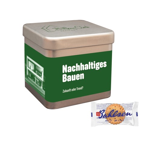 Custom square tin filled with original Hit-Minis. Personalization options include a printed wrap around body label, a printed lid, or a combination of both – perfect for stylish, branded gifting.