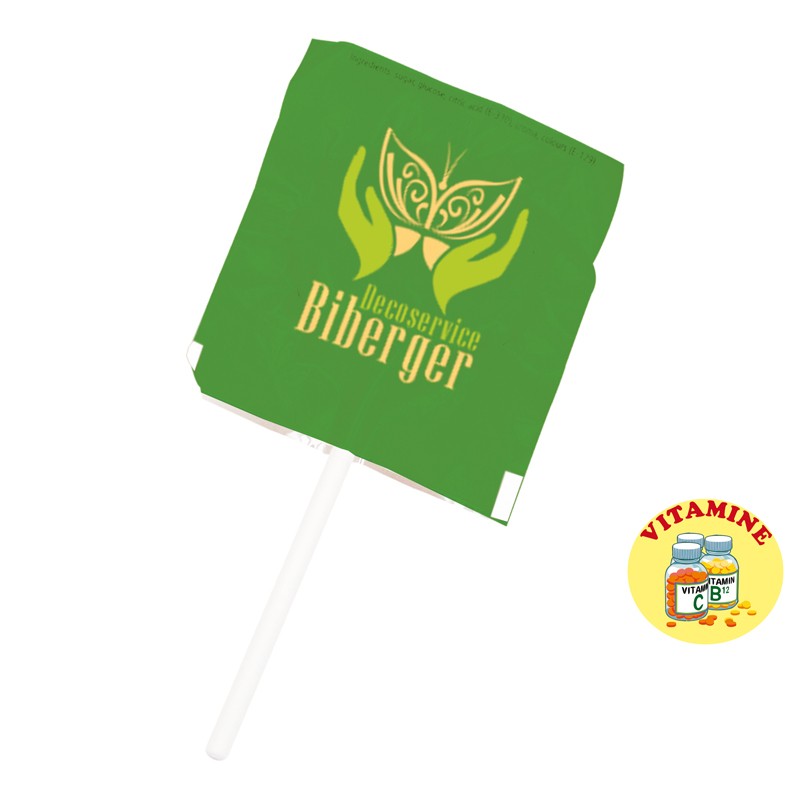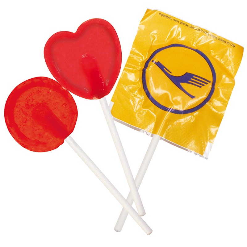 Lolly flat, round or Round or heart-shaped multivitamin flat lollies in printed white or transparent foil. 1 flavor per 10,000 pieces. If you want a mix of different flavors (e.g. lemon, cherry, mandarin, apple, cola, strawberry, etc.), you can specify 1 flavor per 10,000 lollipops.heart shaped, with centered print in personalized foil. 1 flavour every 10.000 pieces.