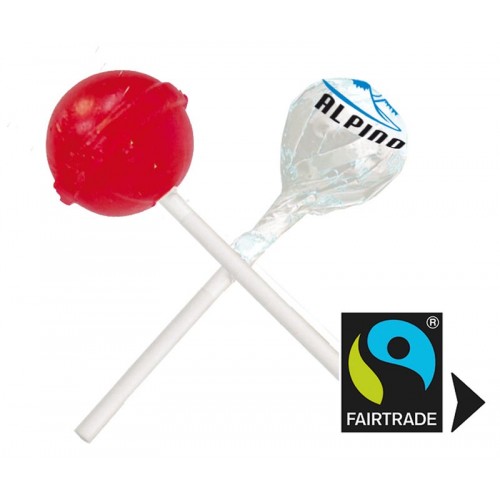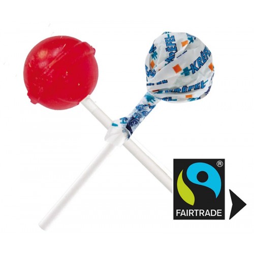 FAIRTRADE ball lollipop in printed white or transparent foil. Your advertising will be printed in the center of the film. Foil sealed around the style. You can choose one flavor for every 6,000 ball lollipops.