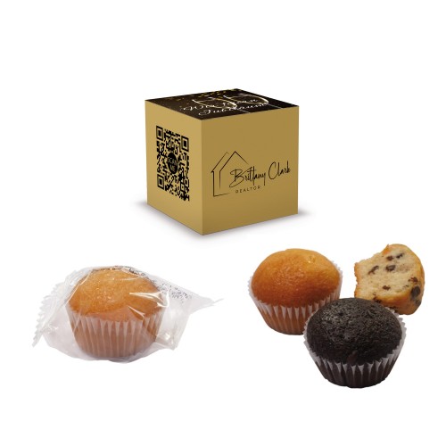 Assorted mini muffins in three delicious flavours, individually wrapped in clear foil and stylishly presented in a custom-printed cube box – perfect for promotional gifting.
