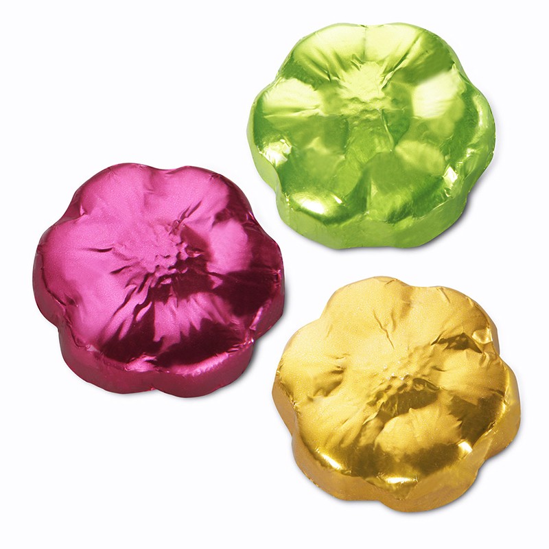 Chocolate flower with printed foil. Finest milk chocolate with 33% cacao.