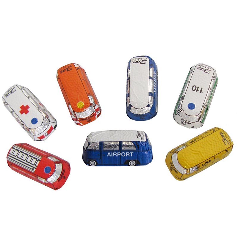 Chocolate bus with printed foil. Finest milk chocolate with 33% cacao.