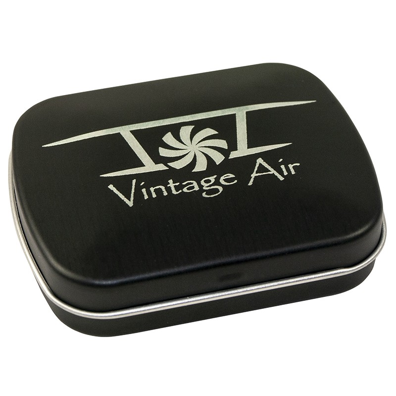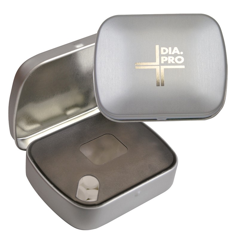 Rectangular tin with hinged lid. Laser engraving on the lid. Filled with fresh-mints, sugarfree. Available in silver dull or black dull.