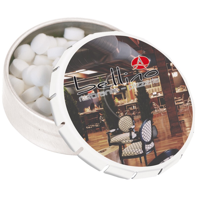 Clic-Clac tin, easily opened by pressing on the center of the lid. Available in different tin colours. Filled with fresh-mints, sugarfree. Full colour print on the lid.